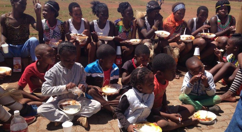 Khutsong children eating while they are being edutained (Educated and Entertained) by Papi and the Hit Parade